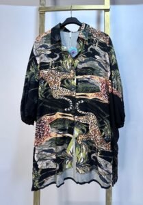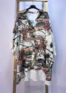 Blusa de corte oversize con cuello camisero y cierre de botones. Disponible en fondo blanco o negro, con un llamativo estampado safari de animales (jirafas, leopardos, elefantes y vegetación tropical). Su diseño holgado y fluido aporta comodidad, mientras que el estampado la convierte en una prenda llamativa y con personalidad. Ideal para combinar con jeans, pantalones anchos o shorts para un look fresco y con estilo étnico.
