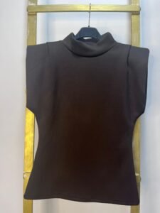 Blusa estructurada en color negro con diseño sin mangas y cuello alto doblado. Una pieza minimalista y elegante, ideal para combinar en looks formales o casuales chic