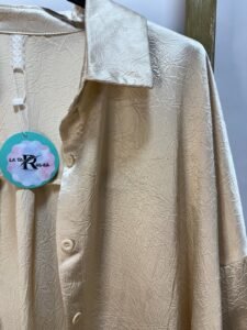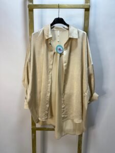 Camisa de corte oversize en un elegante tono beige con acabado satinado y sutil textura arrugada. Presenta cuello clásico, cierre frontal con botones y mangas largas con puño abotonado. Su diseño fluido y ligero la hace ideal para llevar tanto abierta sobre un top como cerrada para un look más sofisticado y moderno. Perfecta para estilos casuales o formales con un toque chic