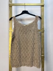 Chaleco sin mangas en tejido crochet beige con diseño calado en rombos. Fresco, versátil y con un aire boho elegante, perfecto para llevar solo o en conjunto con la falda y chaqueta a juego