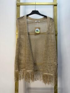 haleco abierto en tejido calado con acabado metalizado en dorado. Diseño ligero y versátil, rematado con flecos decorativos en el bajo que aportan movimiento y un aire boho-chic. Ideal para superponer sobre vestidos, blusas o tops, añadiendo un toque único y sofisticado al look.