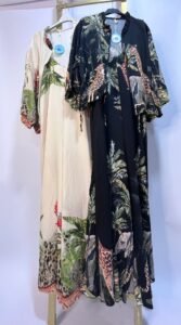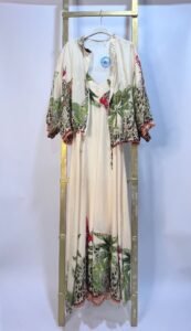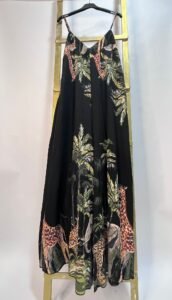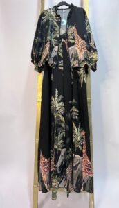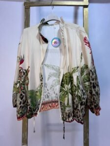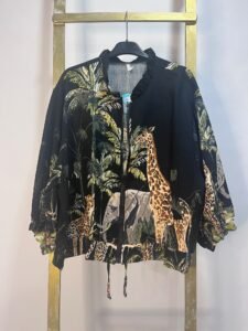 Conjunto compuesto por una chaqueta ligera de manga abullonada con estampado de animales salvajes y vegetación tropical, acompañado de un vestido pantalón largo y fluido con el mismo diseño. Disponible en combinación de fondo marfil y negro, este conjunto destaca por su estilo bohemio y sofisticado, ideal para lucir en vacaciones, eventos al aire libre o para dar un toque atrevido y elegante al día a día.
