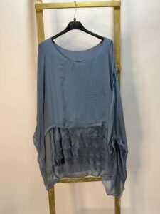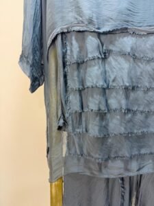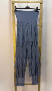 Este conjunto está confeccionado en tela ligera tipo gasa en tono azul grisáceo, compuesto por una blusa de manga 3/4 con caída asimétrica y detalles de capas con volantes en la parte inferior. El pantalón es fluido, de pierna ancha, con varias capas deshilachadas que aportan movimiento y estilo bohemio. Es ideal para un look elegante y relajado, perfecto para eventos de verano o primavera