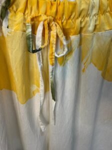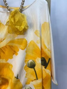 Conjunto de lino de dos piezas con estampado de grandes flores amarillas, blusa de caída fluida y pantalón ancho, ideal para un look fresco y elegante