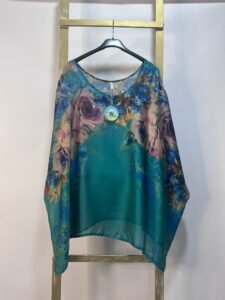 Conjunto de blusa amplia y pantalón fluido en tela satinada con estampado floral multicolor. Elegante, cómodo y perfecto para ocasiones especiales