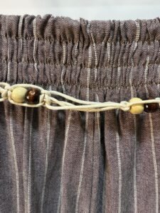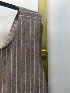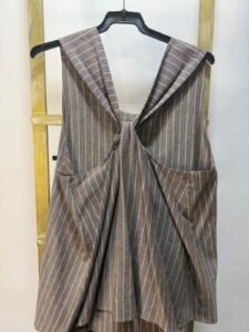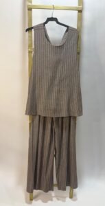 Este conjunto de dos piezas combina estilo minimalista con comodidad. La blusa sin mangas de corte recto presenta un cuello en V suave y un diseño de rayas verticales en tonos marrones y beige, que estilizan la silueta. El pantalón a juego tiene un corte palazzo amplio y fluido, ofreciendo libertad de movimiento y frescura para el día a día. Perfecto para looks casuales o para un estilo relajado y elegante en climas cálidos