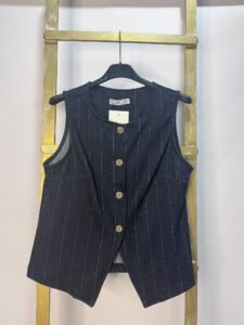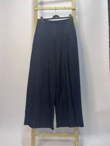 Conjunto de dos piezas en tela con rayas finas, compuesto por chaleco sin mangas de botones y pantalón palazzo de pierna ancha. Un look moderno y elegante con estilo clásico renovado