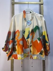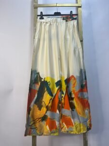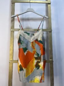 Conjunto de tres piezas en tela satinada con estampado artístico en tonos naranjas, amarillos y grises. Incluye blusa ligera, pantalón fluido y top con encaje, perfecto para un look elegante y moderno.