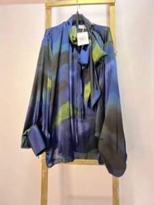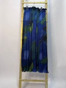 Conjunto de dos piezas en satén estampado en tonos azul y verde. La blusa cuenta con lazo en el cuello y mangas abullonadas, mientras que la falda plisada aporta movimiento y ligereza. Ideal para un look distinguido y con mucho estilo