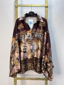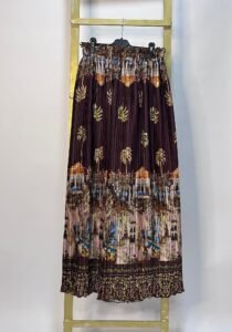 Conjunto de blusa de manga amplia y falda plisada en tela satinada con estampado artístico en tonos marrones, dorados y detalles coloridos. Una propuesta elegante y única para destacar con estilo
