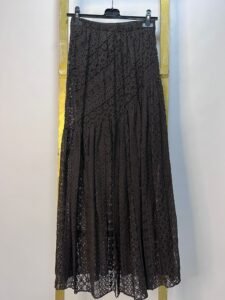 Falda amplia de encaje en color negro con diseño en transparencias y cintura elástica. Una pieza versátil y femenina, ideal para looks elegantes o casuales chic