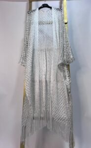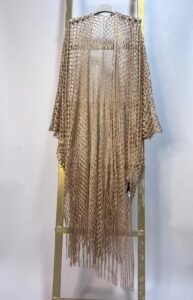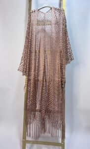 Kaftán largo elaborado en tejido calado con acabado brillante, disponible en tonos blanco, dorado y bronce rosado. Presenta un diseño ligero y fluido con flecos en el borde inferior que aportan movimiento y un aire bohemio elegante. Ideal para superponer sobre vestidos o trajes de baño, combinando comodidad con un estilo sofisticado y versátil.