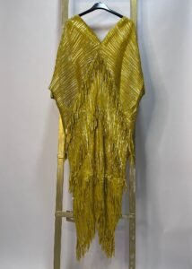 Kaftán largo en tono dorado metalizado con textura plisada y detalles de flecos que aportan movimiento y estilo. Una pieza llamativa y sofisticada para destacar en cualquier ocasión