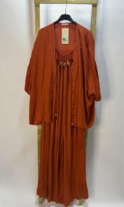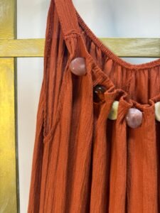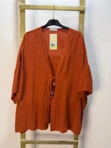 Kimono corta en tono teja, confeccionada en tela ligera con textura arrugada. Presenta mangas cortas amplias y un cierre frontal con lazo decorado con cuentas, aportando un estilo bohemio y relajado. Ideal para usar como sobreprenda en climas cálidos o para dar un toque casual y elegante a tu look.