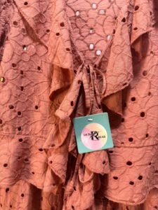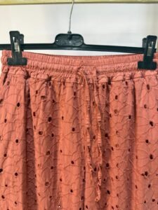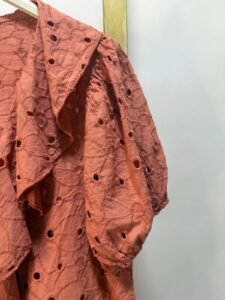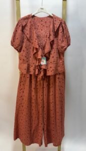 Mono de una pieza en color terracota con delicado diseño calado y textura arrugada. Cuenta con mangas cortas abullonadas, escote en V con volantes y cierre frontal con lazo. Su tela ligera y transpirable lo hace perfecto para días cálidos, ofreciendo un look fresco y femenino. Ideal para ocasiones casuales o paseos veraniegos