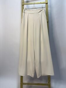 Pantalón estilo palazzo en color beige, confeccionado en tela ligera y fluida que aporta comodidad y elegancia. Su diseño incluye pinzas frontales, bolsillos laterales y pretina elástica en la parte trasera para un mejor ajuste. Su silueta amplia y caída sofisticada lo convierten en una prenda versátil ideal para looks casuales o formales