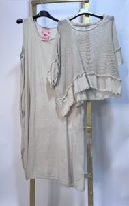 Vestido estilo boho en tonos beige y verde militar, con textura tipo malla en la parte superior. Detalles de volantes con bordes deshilachados en mangas y cintura. Look desenfadado y cómodo, ideal para el día a día
