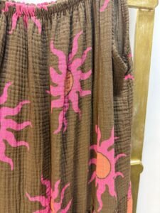 Vestido veraniego de tirantes finos con escote recto fruncido. Su diseño presenta un estampado de soles en color fucsia sobre fondo marrón, aportando un estilo bohemio y alegre. La falda tiene caída amplia y ligera, perfecta para climas cálidos o looks casuales y playeros
