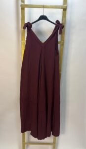 Vestido largo en color burdeos, confeccionado en tela ligera con caída fluida. Presenta escote en V tanto en la parte frontal como en la trasera, y tirantes con lazos ajustables en los hombros que aportan un toque delicado y femenino. Perfecto para un look casual veraniego o para combinar con accesorios elegantes en ocasiones especiales