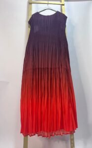 Vestido largo plisado con diseño en efecto degradado que va del tono berenjena al rojo intenso. De corte suelto y fluido, con mangas cortas y escote redondo. Una prenda sofisticada que combina comodidad y estilo, ideal para ocasiones especiales o looks de verano con un toque elegante.